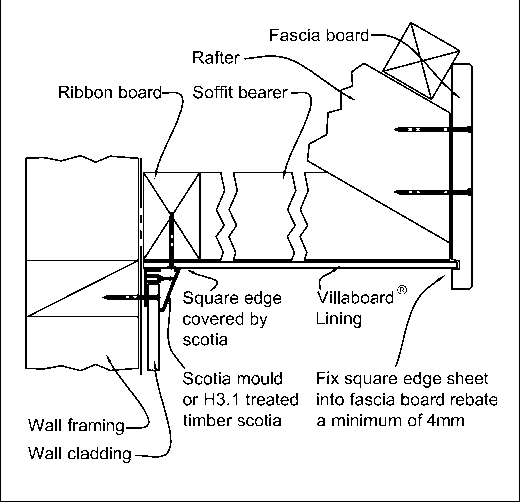 | Existing Internal linings (Indicative) |  | Timber eaves mould 40x27, H3.1. Paint finish. Existing fibre cement soffit retained. Continuous sealant bead. |