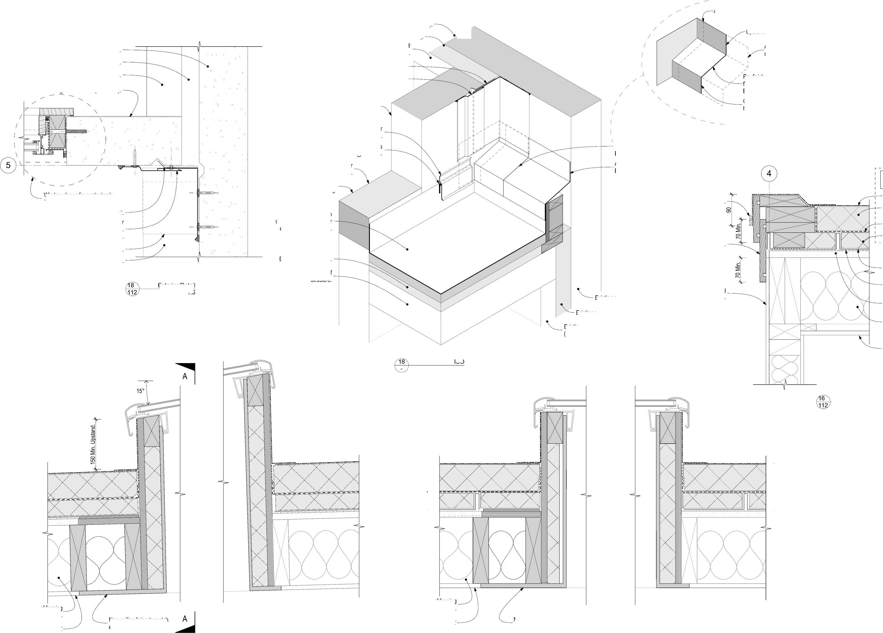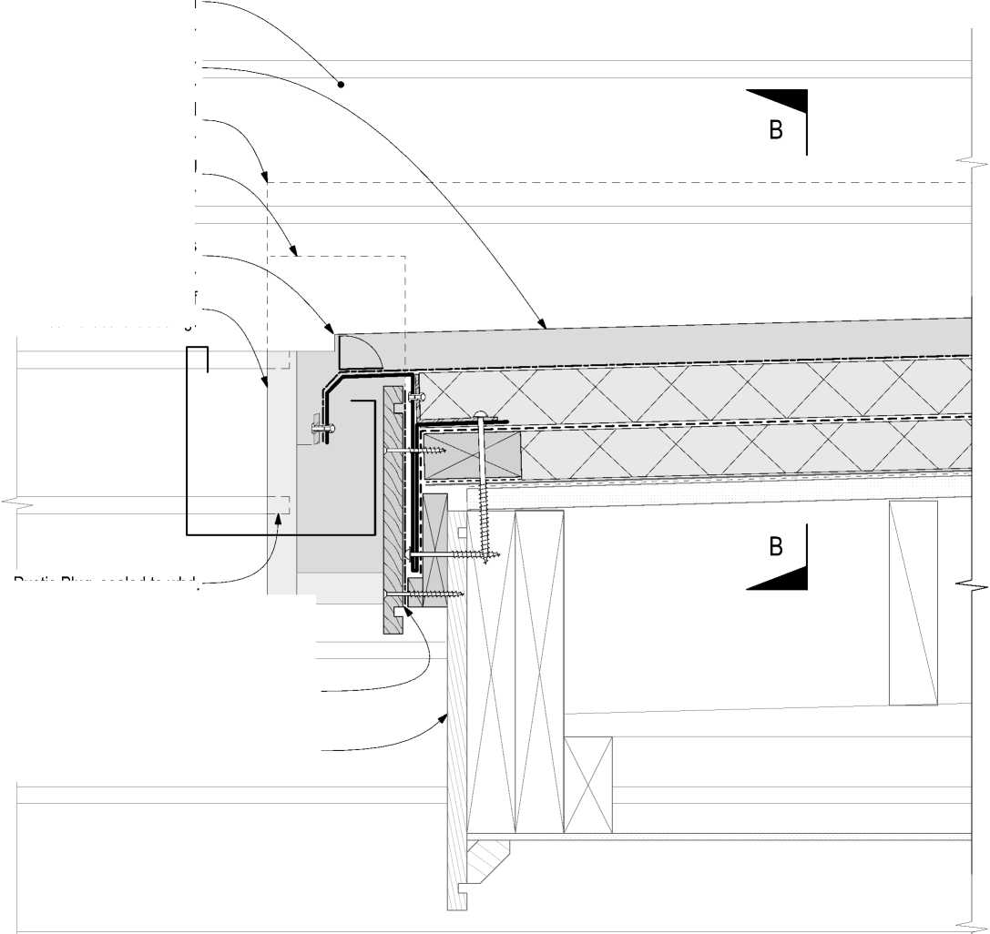 | Rustic Plug, sealed to wbd. Aluminium pressure bar New fibre cement panel cladding on drained cavity to Hall gable. New horizontal cladding change band. Folded powder coated aluminium flashing, BMT 2.0 Min. Membrane saddle flashing. Membrane internal corner back flashing. New fascia board, H3.2, Paint finished. Membrane upstand behind cladding shown hidden. Membrane internal back flashing taken up behind roof membane. Existing timber framing (Indicative). Existing fascia board retained if suitable C.O.S. |   560 REF. N.T.S. |